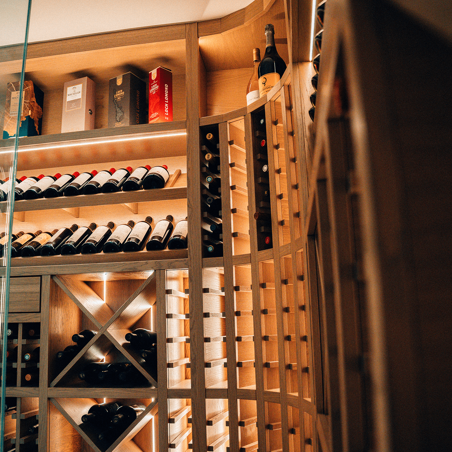 Some clients require long-term horizontal storage for maturing Bordeaux or Burgundy. Others focus on vertical presentation for champagne and whisky. Increasingly, private homeowners throughout Central Scotland request hybrid spaces, wine, spirits, cigar humidors and tasting counters integrated into one cohesive design.